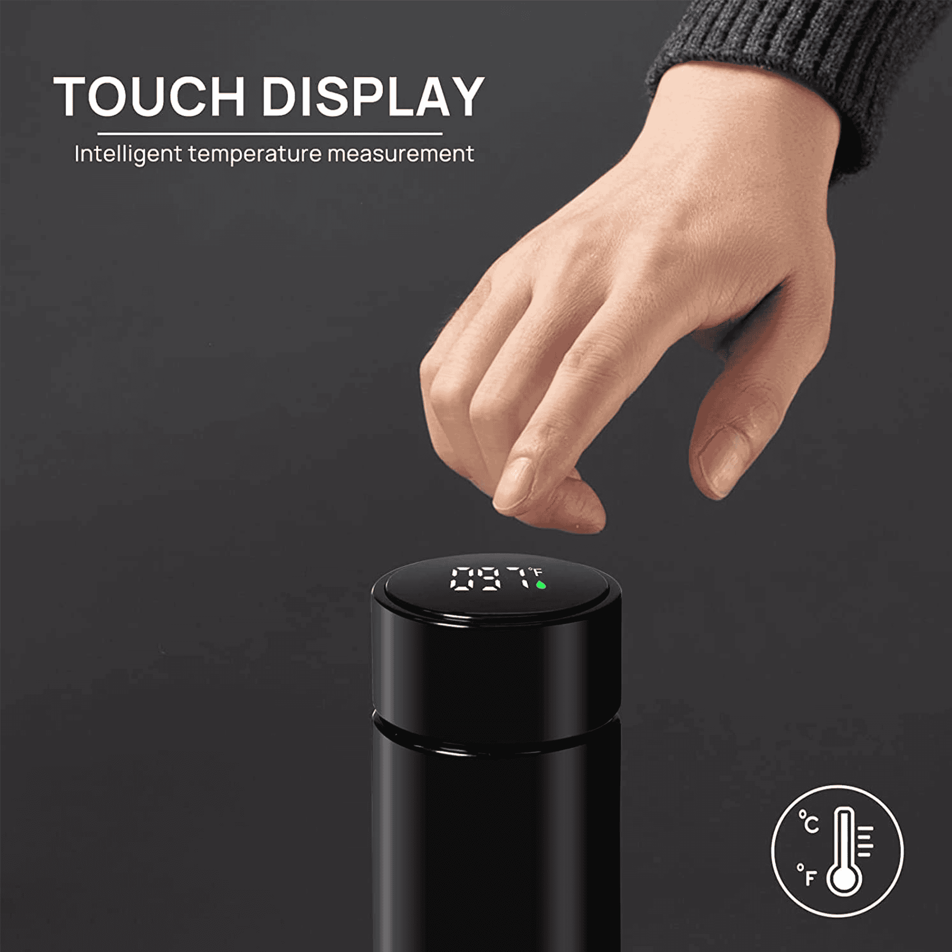 La pantalla Tactil LED inteligente de la temperatura del agua en tiempo real, te informa la temperatura de tu bebida. El interruptor táctil se enciende y se apaga automáticamente en 3 segundos.Esta taza de estilo tiene una pantalla LED inteligente de temperatura en la parte superior del termo que durará hasta 40.000 toques sin un cambio de batería.
